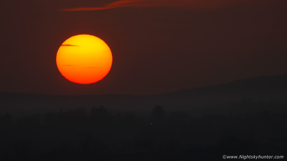 I wasn't disappointed, as the sun dropped into the haze the disk became visible, first as a yellow orb then an orange globe, the Saharan dust certainly contributed to the spectacle, it really did look like a dusty desert sunset. I was using the Canon 600D with 100-400mm F/5.6 lens at 400mm, I didn't even take the tripod out of the van, I was hand holding these shots by leaning across a tall head stone in the graveyard with IS on while using live view to compose my shots. This is the full disk above the horizon minutes before setting, the horizon was flat and perfect here, however you can just make out the slant to the right which is the flank of Slieve Gallion.