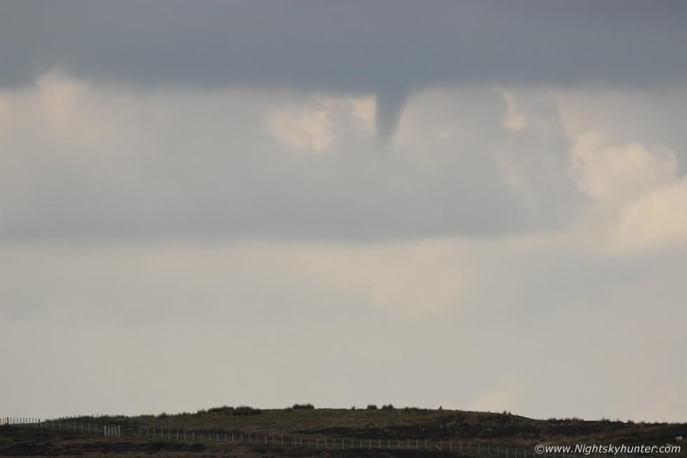 Then it turned into a small rope and suddenly vanished back into the cloud base. When I first saw it the time was 12.45 UT, now it was 13.05 UT, it had been visible for 20 min's, however factor in the time at the beginning before I first saw it the duration could be closer to 25 min's. This makes it the longest duration funnel I've ever witnessed, even longer than the big funnel of July 17th 2007. Even though this was a small funnel it was still an absolute thrill to experience, especially so early in the season. In fact, I just checked my log book, this is the earliest funnel I've ever captured. So what happened? I suspected a convergence zone combined with solar heating, weak instability and lift from the high ground was the likely cause. Storm photographer Owain Rice from Co. Down did a little back ground work and after studying skew-Ts noted that there was CAPE in the first 3km of the atmosphere with good moisture, however there was also a cap at the mid levels which explained the soft tops. I took this as a good omen of what could be on the cards this Summer when the bigger vorticies put on a show.