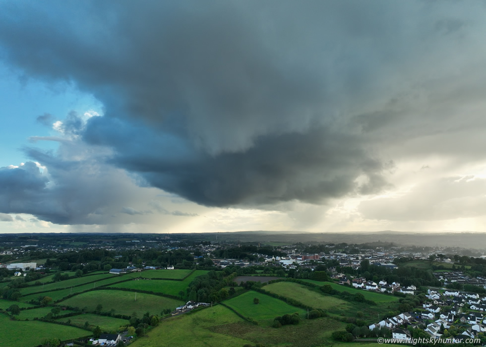I panned the drone back around to the SW to get a visual on the other cells showing on radar. These were very interesting, two cells on view to the SW of Cookstown. The distant cell is near Dungannon and the closer cell was approaching Cookstown itself, take a look at the visual aspect of these showers, they all have the classic characteristics of highly sheared convection. First look at the Dungannon cell, well defined rain free updraught base, tilted updraught tower, precip and anvil sheared away from the base. The Cookstown cell is the exact same only closer, the updraught is hidden behind cloud however the updraught base is identical to the Dungannon base. Isolated, rain free, well defined, inflow dominated.