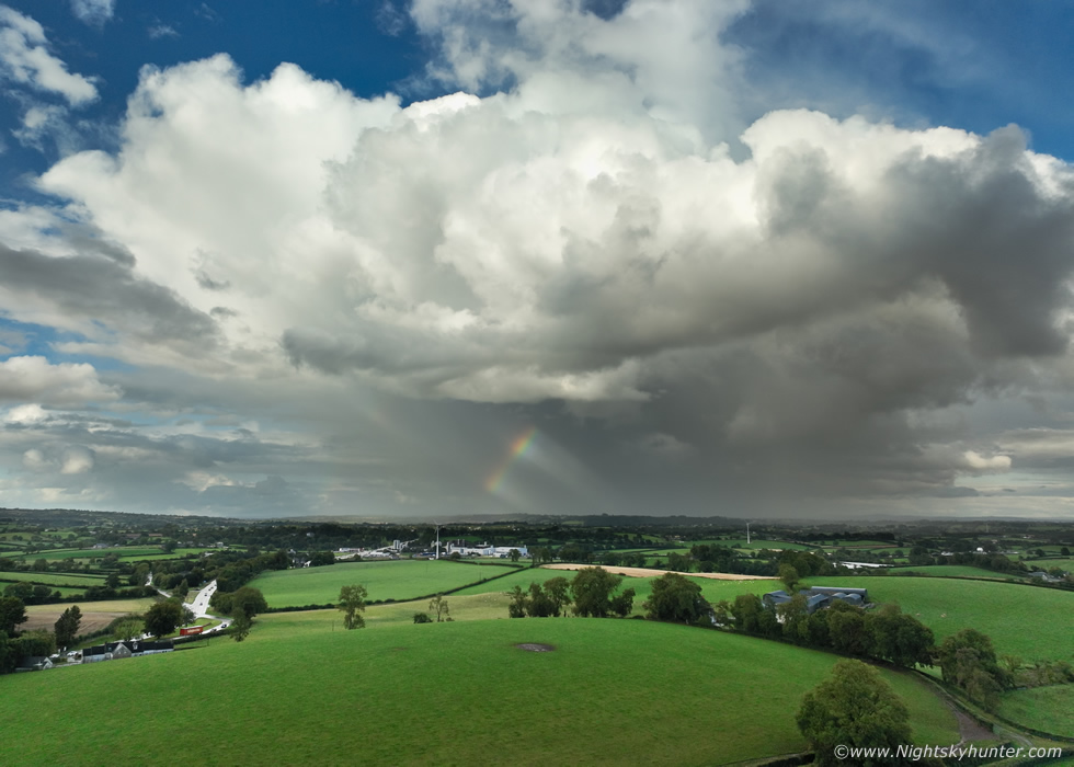 I ended up on the Omagh road and took a minor road into the countryside not far from Kildress and already my target cells was coming into view so I got the drone in the air to escape from the tree-cluttered foreground for a better view. This was that sheared cell, now between Omagh and Cookstown and stretching far out of frame to the right over the Sperrins. I could tell through the gaps that the tops were low but it did have a long base with heavy precip along much of its length. To tell you the truth this was more than I expected, I was actually seeing storm clouds, such a rare sight this Summer so I quickly became invested in the day.