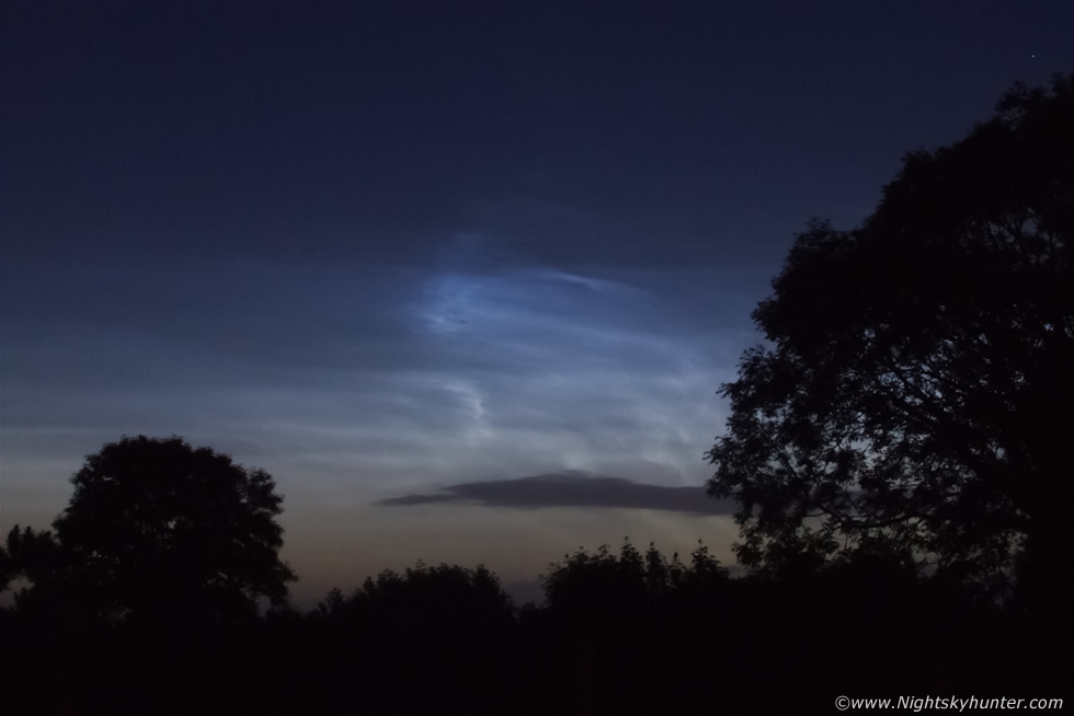 Noctilucent Clouds glowing over the misty pre-dawn skies of Maghera on July 13th 2006 and framed by the majestic trees in the countryside adjacent to the Crewe Road outside of town. This compact display suddenly manifested in the last two hours before sunrise with veil, knots and tiny lacunosus pits, the scene was underscored by a lonely dark strip of tropospheric cloud. This was captured with my old Fujifilm Fine Pix S5600 5MP bridge camera. * All images are available for sale in the form of photo prints, canvas or digital files for licensing, if you are interested in a purchase simply drop me an email. |