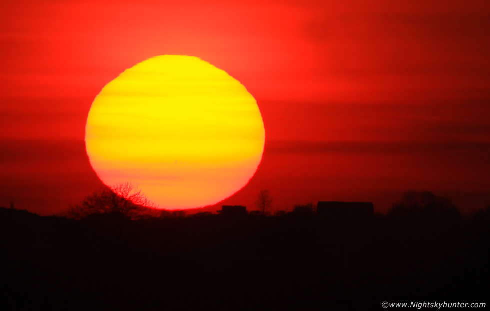 Beautiful sunset captured from Kildress church outside Cookstown on April 9th 2015 during a lovely period of warm high pressure weather over the Easter holidays. This was captured at 400mm using the 100-400mm USM lens, the solar disk was large and comfortable to watch with the naked eye as it sank slowly into a layer of haze hugging the flat horizon in the warm evening light accompanied by the peaceful sound of a distant lawn mower with Birds singing in the tree branches. The sun's disk sported a surreal yellow-red colour and at times a large sunspot could be glimpsed on the LCD screen, I also took time lapse video footage through this same lens which can be viewed on my youtube channel. * All images are available for sale in the form of photo prints, canvas or digital files for licensing, if you are interested in a purchase simply drop me an email. |