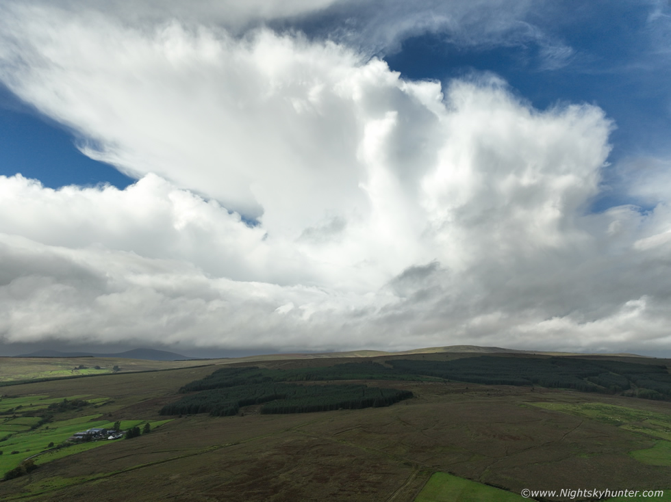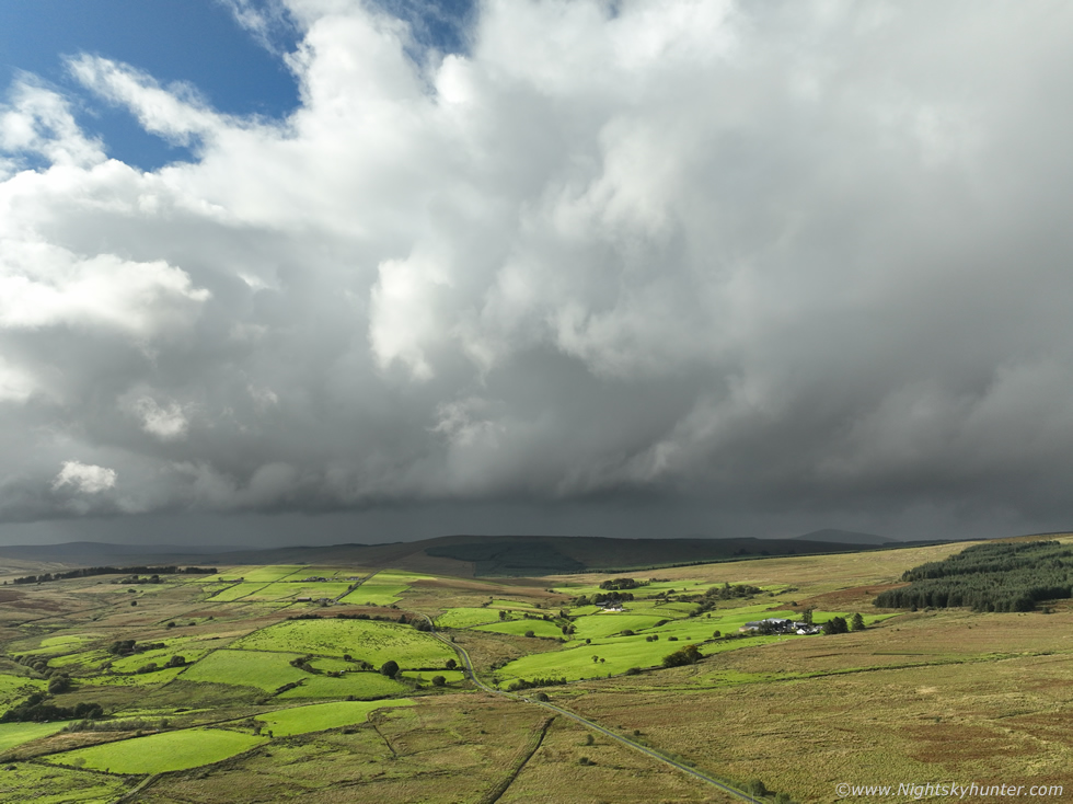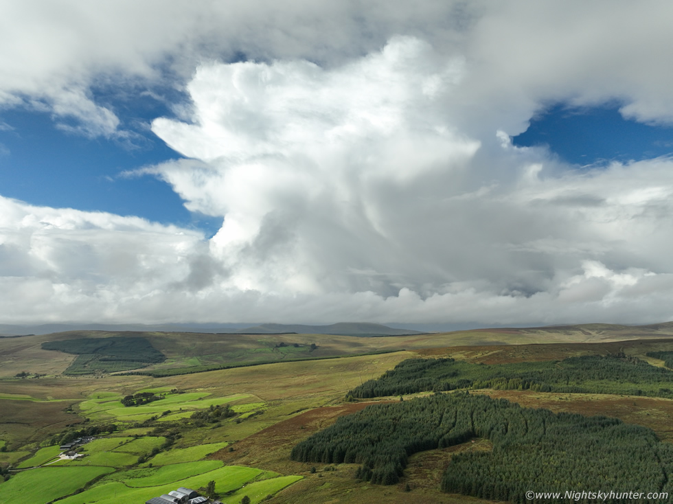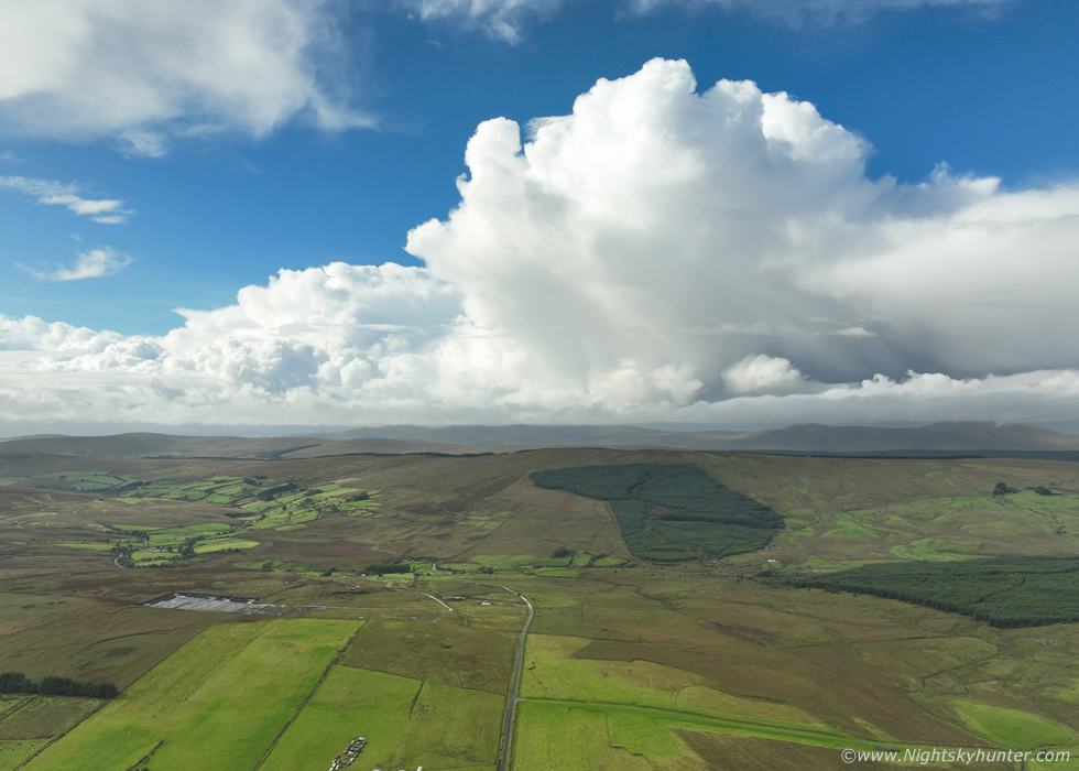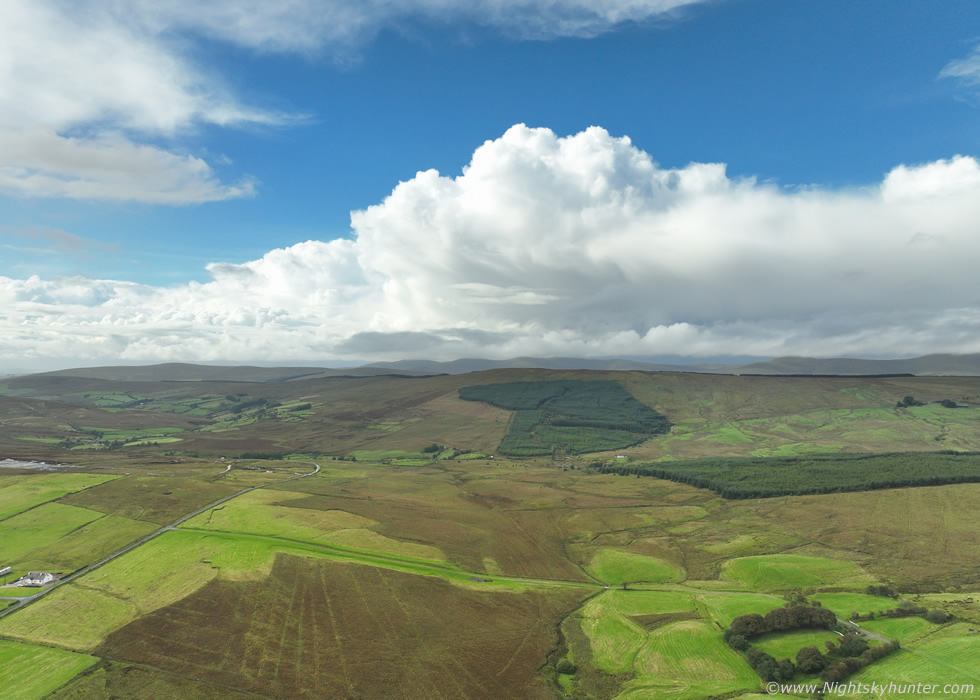 My view of the sky had been blocked by the trees in the forest so when I entered a clearance on that back country road the entire sky was unveiled and much to my delight was a huge sector of blue skies to the NW with clearing cloud overhead and in the distance was a big row of beautiful sunlit convection which was the best I had seen all day. I pulled over at the side of the road to study the sky, mmmm, I wasn't going home anymore, this was too good to ignore, I liked the look of the convection, the updraughts were big and fairly solid, their bases seemed to go all the way down to near the surface, I even saw a tiny pileus cap above one updraught, a visual cue from nature that the sky had potential. The convection was far away, there was no doubt it had come in over Donegal and was making it's way across the Sperrins, the cluster was definitely getting closer, I decided I would find a good spot and get the drone up for a look.