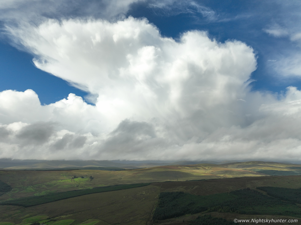 A gorgeous mature Cumulonimbus dominated the sky, lit brilliant white by strong sunshine and framed by a deep blue sky background. The sight of it over the Sperrins, an area of outstanding natural beauty, made the moment even more special. Pockets of sunshine would light up the landscape bringing a combination of light and shadow, tones of green, orange and brown complimented the icy mountain above.