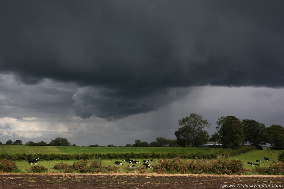 June 28th 2011 located in the countryside close to the north of Maghera on a lovely warm day. I had been entertained by a nice line of convection which erupted to life during the late afternoon with high contrast black storm clouds brewing low over the brown and green fields as the cows lazily whipped clouds of flies away with their tails, the strong sun cooked the ground causing me to break out in sweat and further invigorate convective development. This was a convergence zone where air from different directions meet resulting in upward motion which acts as a form of lift forcing air parcels vertically into the atmosphere, if the day is unstable with enough moisture then this act alone can generate thunderstorms rather easily. Warmer air aloft stopped any chance of lightning this day however everything else was in place with a line of tall and strong updraught towers in a sheared environment which in conjunction with convergence made for an impressive line of storm clouds which were rich in lively motion. Along this entire base I watched as inflow in the form of rising scud into the base caught my eye then for the next 25-30 min's I watched several areas of strong rotation in unison as the base tried to produce several funnel clouds, although I never got a spout watching the twisting and the sheer entertainment of not knowing what was going to happen next made this a very memorable day. * All images are available for sale in the form of photo prints, canvas or digital files for licensing, if you are interested in a purchase simply drop me an email. |