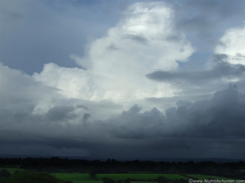 Same cell only concentrating on the centre and flank. Erupting towers going up at the rear taking advantage of the late evening Sun and instability. To get a sense of size compare with the white house below. The large anvil seen side-on even extends out of the frame to the upper L. In reality everything visible here was absolutely solid/crisp and sharp indicating powerful updraughts. After firing off many images I eventually caught my breath and got a chance to study the entire line. There was so much to look at. At this time there were reports of a massive cell with lightning over Portrush on the N coast of N. Ireland, and I could actually see it from here in Maghera!. It looked crazy in that direction with the cells behind it producing outflow scud which looked to be touching the ground.