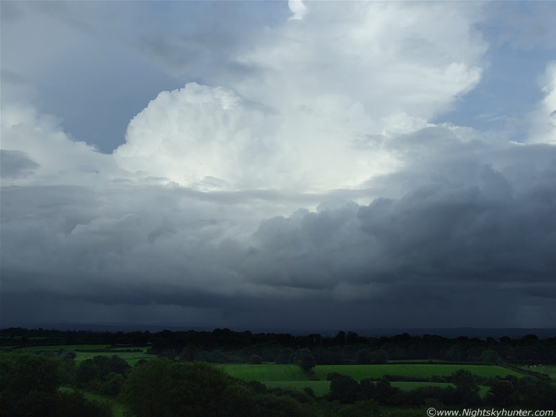 Nothing is ever straight forward, I just wanted to photograph storms from a peaceful location away from people and now the animals were protesting. I just blended into my environment and stayed quiet. Eventually harmony returned to the area, the Cows and Sheep were at ease and Rabbits darted across the fields. I had been accepted at last. My theory had been correct about the motion of the storms, they did indeed pass through the W sector of Maghera over the Sperrin Mountains and extended for miles in that direction. The above image is looking W, facing the E side of those huge storm clusters. The storm is moving from L to R extremely slowly and covered a large area in azimuth when it first appeared, from S to NE. I took about 40 images of it during the that period, in fact it was so slow that it seemed stationary at one stage so I was able to sit on the grass and just admire it in the warm humid air in complete comfort. The side 'wall' which covered it's E flank can be seen, and above, is a thick band of mid level cloud which hid the main structure. Above this, in the occasional gaps, I could see the huge white updraught towers and anvil canopy. Below was a very dark precip core of moderate strength. I couldn't see any lightning or hear thunder because all of the action was taking place on the far side of the precip which the sferics charts confirmed at the time. I was not bothered by this because at least I was seeing a storm, I spent a long time watching for funnels however the storm seemed to be behaving itself on this side so I just watched feeling in a lazy mood. It moved N producing regular lightning for miles (according to the sferics charts).